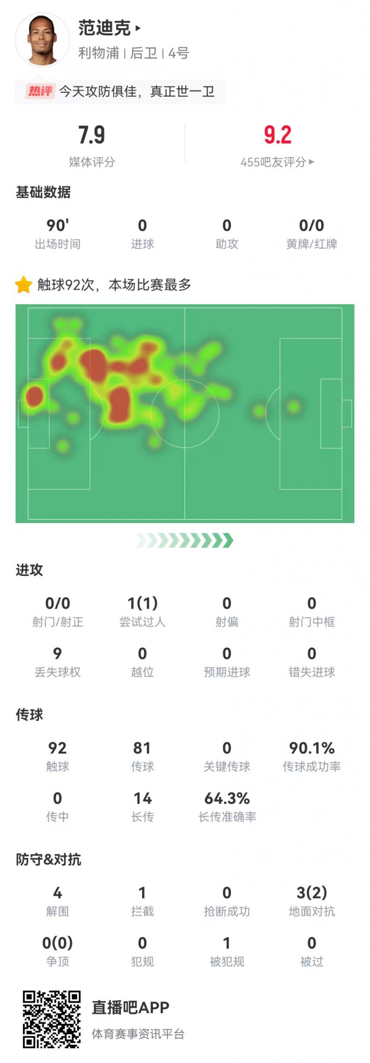 9月1日讯 利物浦在本轮英超1-0绝杀阿森纳,范迪克本场数据如下: