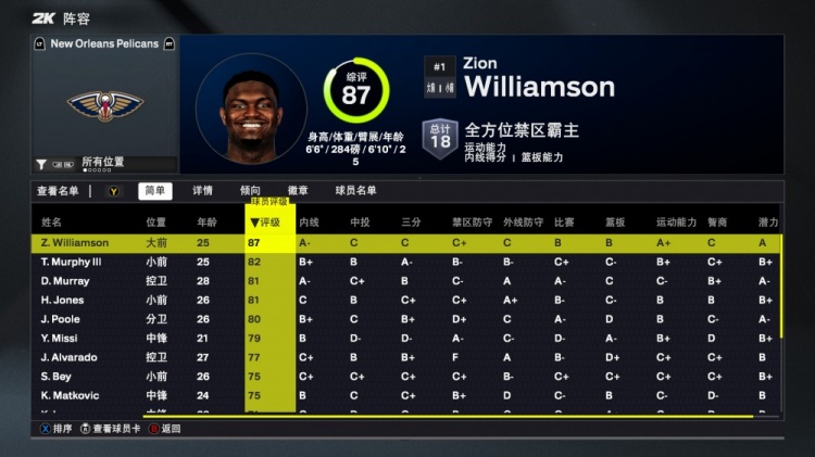 8月30日,NBA2K26游戏正式公布球员能力值,鹈鹕队评分如下: