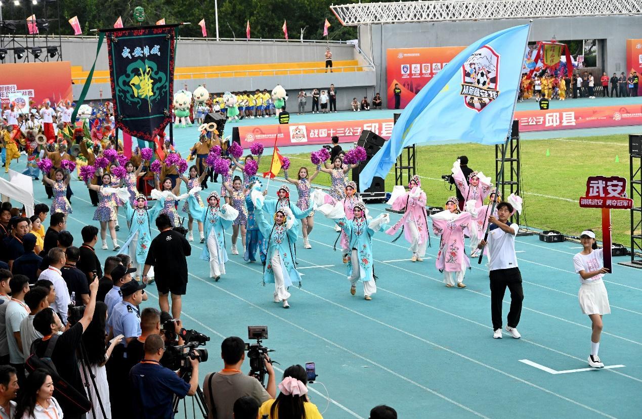 开幕式以“战国十八公子”为主题,独具匠心地将邯郸的古赵文化、成语文化与足球运动巧妙结合。来自各个县(市、区)的18支青少年足球队,按照县区设立时间依次登场,化身为“战国十八公子”,带来了一场极具地域特色和文化底蕴的表演。从公元前206年设立的“大公子”武安,到1980年设立的“十八公子”复兴,每个队伍的方阵表演都融入了当地的非遗元素,如中国戏曲活化石武安傩戏、黑与白的艺术磁州窑烧制技艺、高跷杂技、女娲文化等,让现场观众大饱眼福,领略到邯郸丰富多样的文化魅力。